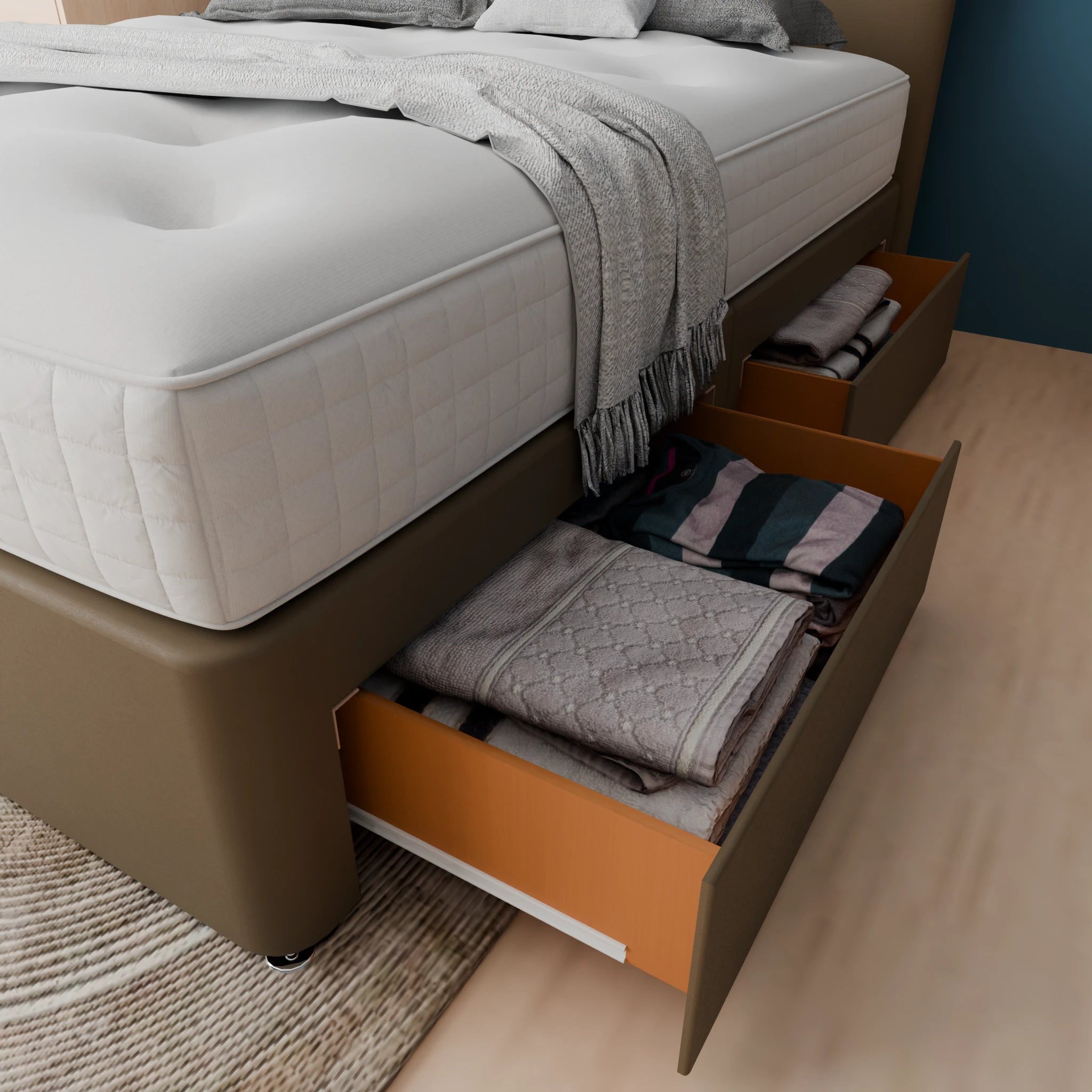 Smart storage is woven into its design. Choose from No Storage, 2 Drawers Left Side, 2 Drawers Right Side, 2 Drawers Foot End, or a full 4 Drawers configuration, all neatly integrated into the base for a clean, uncluttered space. Pair your choice with either a Standard Base or a Reinforced base for dependable support and quiet nights. This is more than a bed; it’s a versatile storage beds solution that works within compact rooms or expansive suites.