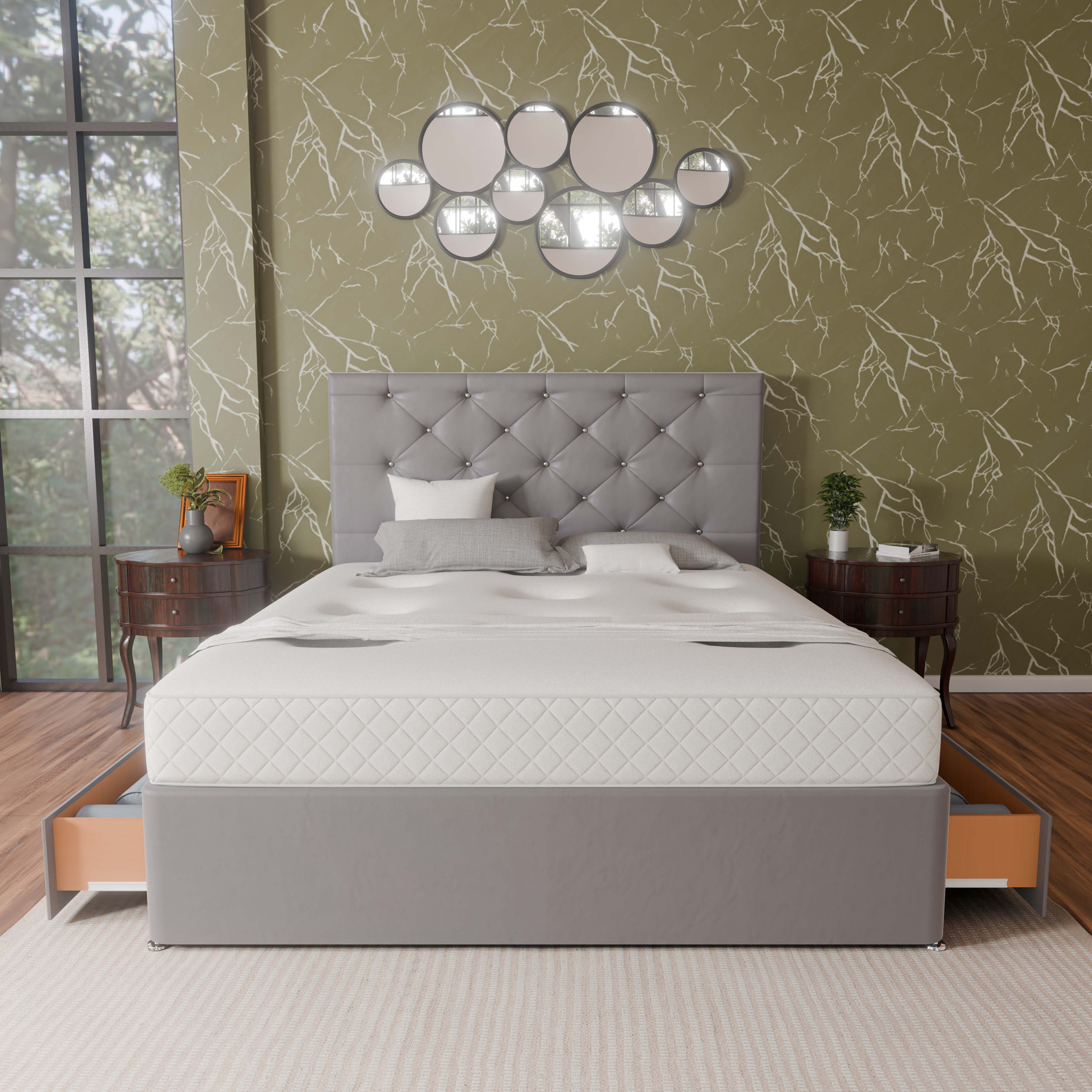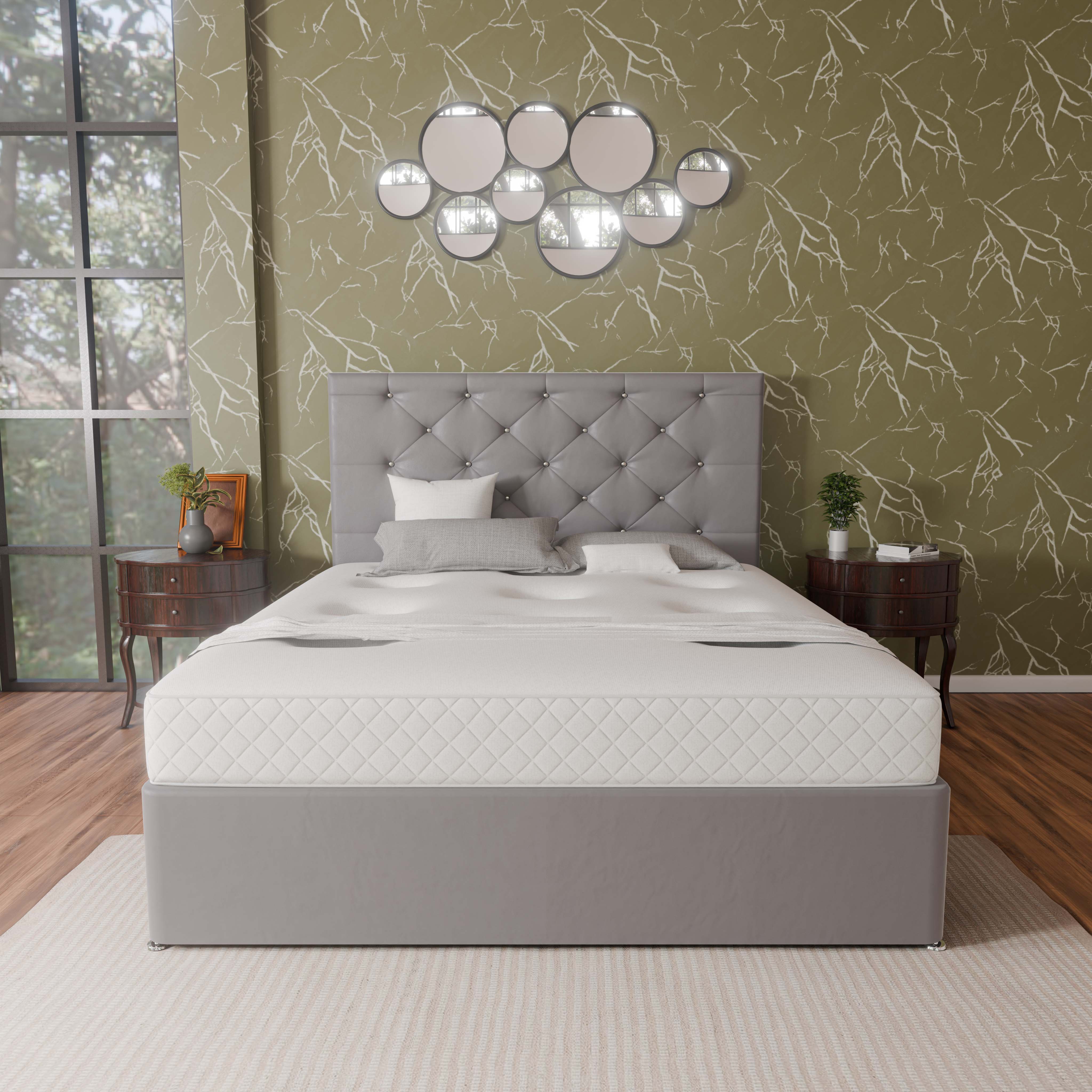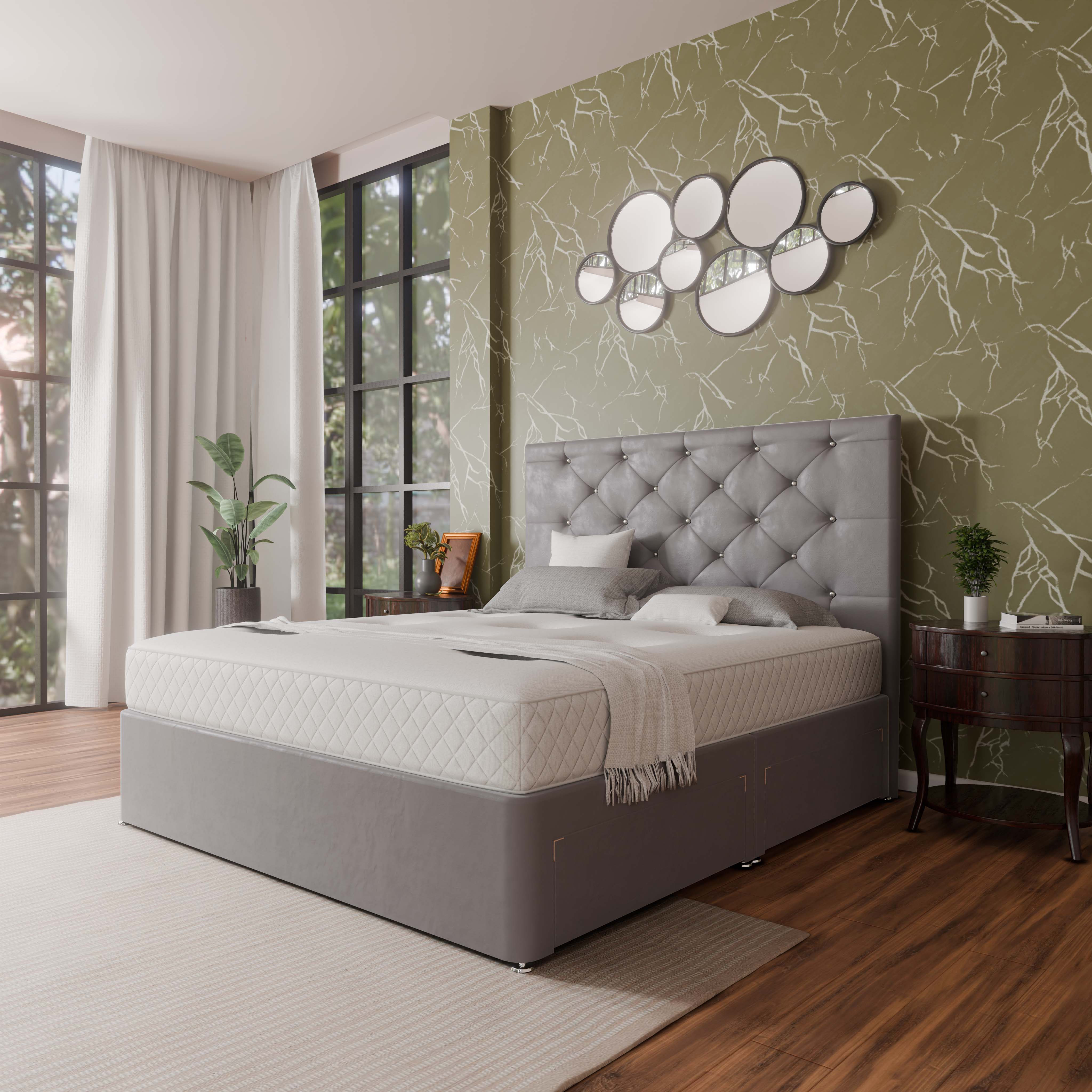 Our Barcelona Divan Bed comes with a choice of headboard sizes, ranging from a simple and elegant style to a more elaborate and statement-making design. The standard headboard size for Barcelona Divan Bed is 26” and you can upgrade it to 54” Floor standing headboard.