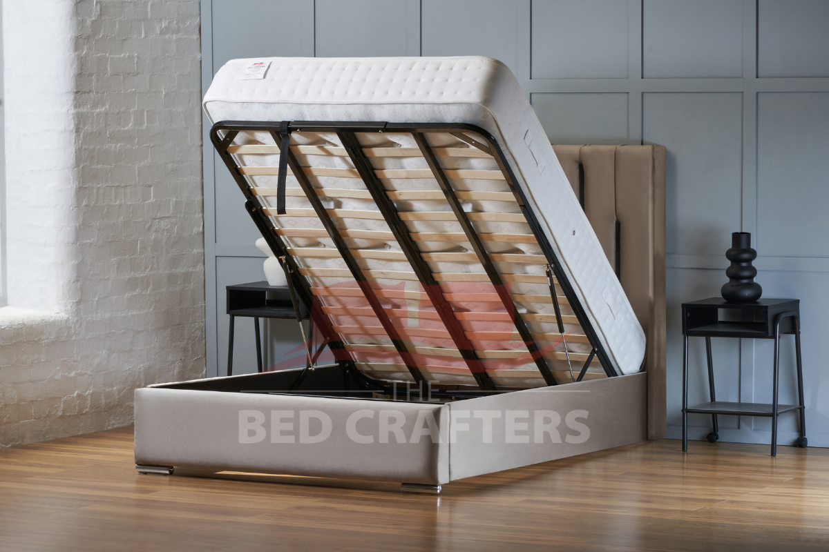 Customization is at the heart of Bed Crafters. The Charleston Wingback Bed Frame is available in Size: Single 3FT, Small Double 4FT, Double 4FT6, King 5FT, and Super King 6FT; Base Type: Slats, Solid Base Board, or Ottoman Gas Lift; Headboard heights: 45\" Standard, 48\" Standard, 54\", 60\", or 72\". For upholstery, customers may select from an extensive range of premium fabrics across Naples, Marble, Lenoso, Teddy Boucle, Dumfries, Plush, Chenille, Coniston, and Crush collections. If storage is a priority, the Ottoman Gas Lift base makes this frame a practical storage beds solution that doesn\'t compromise on style. Free fabric swatches are available so you can feel the texture and tone before you decide.
