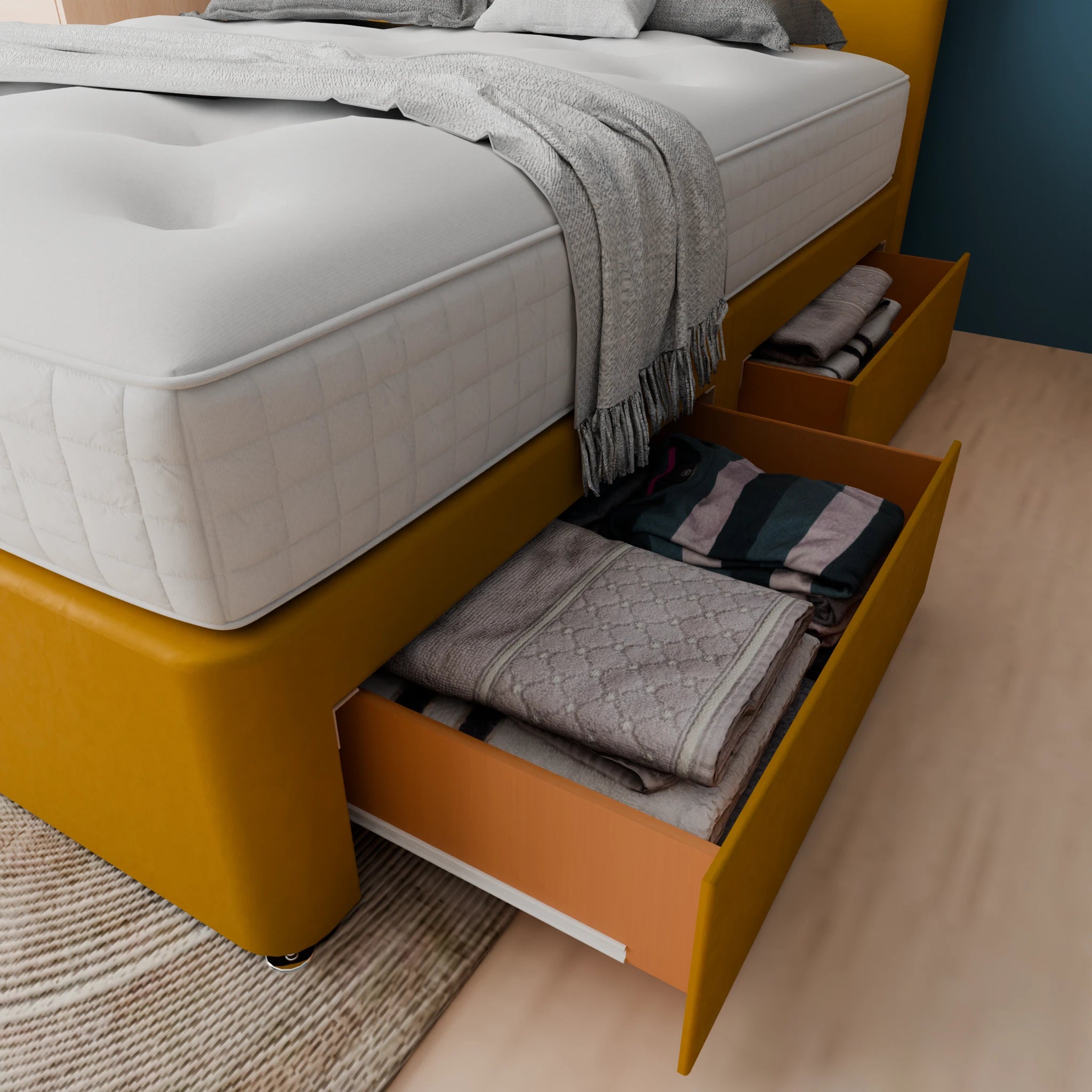 Doha is available in a range of sizes to fit every bedroom. Choose from Single 3FT, Small Double 4FT, Double 4FT6, King 5FT, and Super King 6FT. Storage is equally adaptable: No Storage, 2 Drawers Left Side, 2 Drawers Right Side, 2 Drawers Foot End, or a comprehensive 4 Drawers. You may also select between a Standard Base or a Reinforced base, tailoring the height, support, and durability to your space. Together, these options make Doha a versatile storage beds solution that complements both compact rooms and generous master suites while maintaining the clean, refined lines of a premium divan.