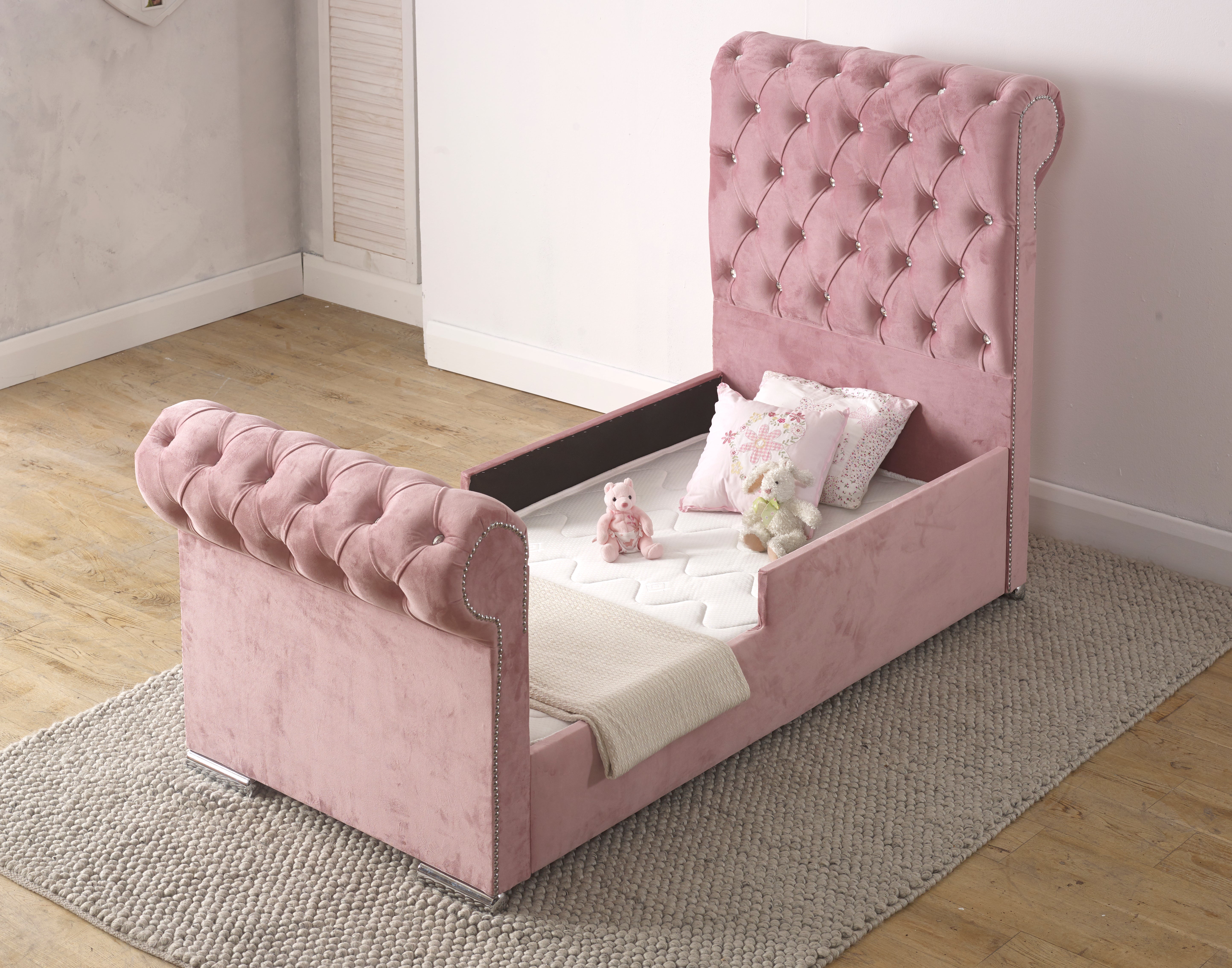 To complement its finish, the Victoria Cot Bed is designed to pair with our extensive upholstery fabrics. Customers can explore premium fabric collections for button styling and upholstered details, including Naples, Marble, Lenoso, Teddy Boucle, and more, ensuring a versatile look that grows with your child. If you’re unsure, you can request free fabric swatches to compare texture, tone, and finish from the comfort of home.